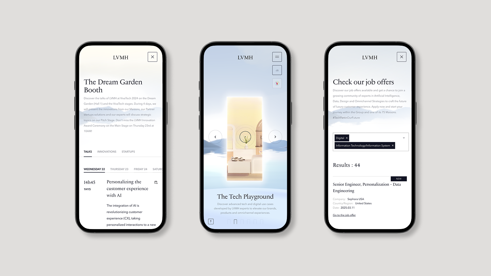 Commissioned by LVMH’s HR department, this immersive space highlights the Group’s tech ecosystem, featuring real-world use cases, testimonials, and key expertise areas. The experience positions LVMH as a creative playground for digital talents, where technology and savoir-faire intersect.